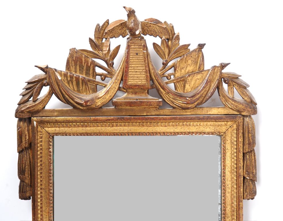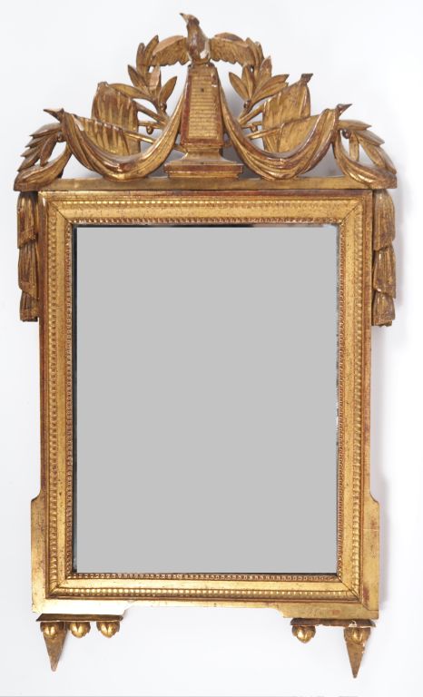 Miroir de style Louis XVI en bois sculpté et doré, fronton ajouré à décor de trophées et d'oiseaux. Dim. 82,5 x 38,5 cm.