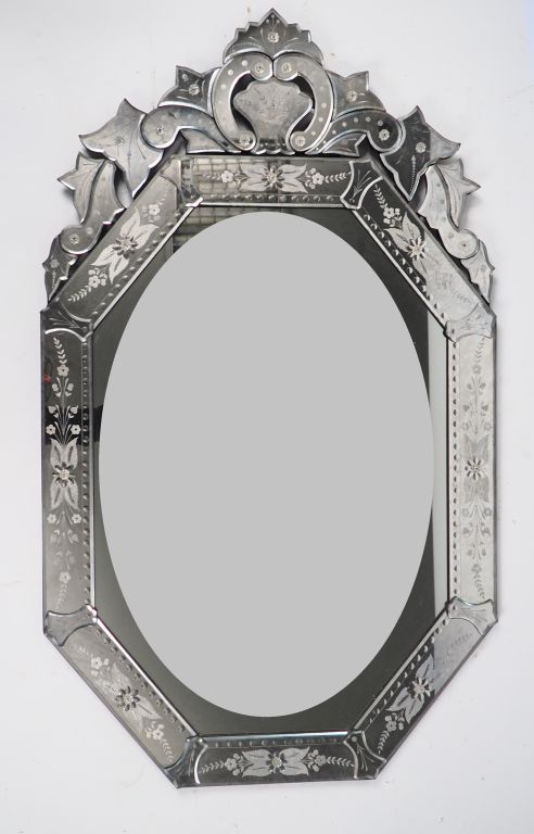 Miroir de style vénitien en verre gravé, à décor de fleurs. Dim. 117 x 69 cm