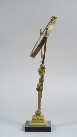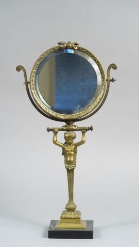 Miroir de toilette en bronze, à décor de jeune atlante, socle en marbre. H. : 45 cm