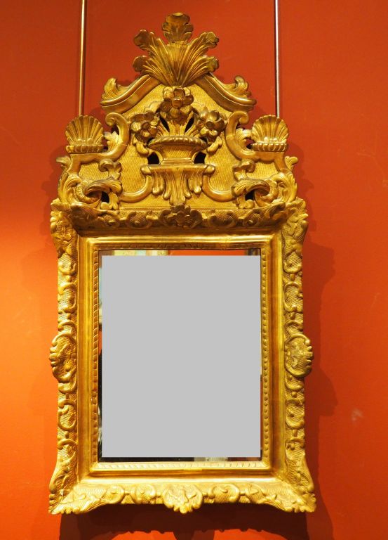 Miroir fin XVIIIème début XIXème en bois et sutc doré à décor de rinceaux et de coquilles, fronton ajouré orné d'une palmette et d'une corbeille de fleurs. Dim. : 110 x 59 cm. (petits accidents).
