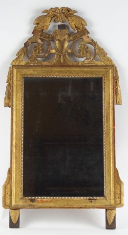 Miroir Louis XVI en bois et stuc doré, fronton ajouré à décor de coeur enflammé, de fleurs et de feuillage
