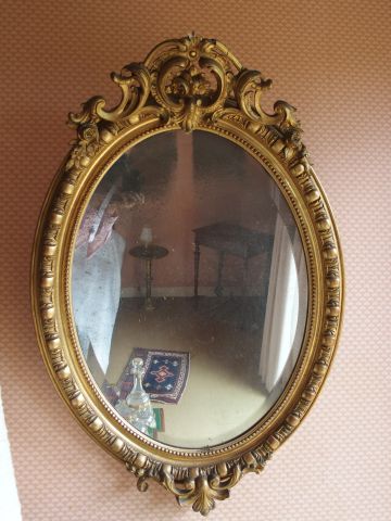 Miroir médaillon en bois et stuc doré, à décor de rocailles et de fleurs. Dim. : 94 x 64 cm