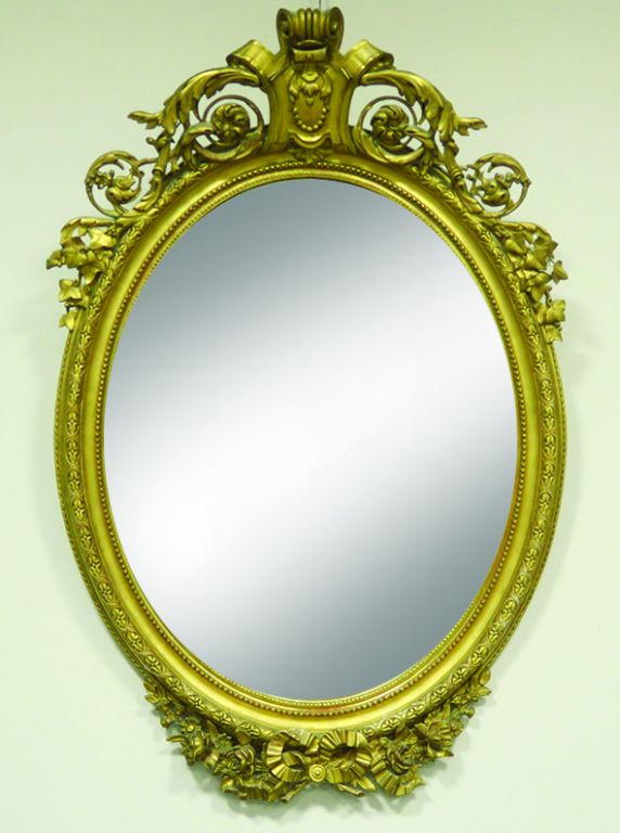 Miroir médaillon Napoléon III de style Louis XVI en bois et stuc doré, à décor de perles, de tiges enrubannées et de nœud de ruban. Fronton ajouré, à décor de cartouche et de rinceaux feuillagés. H. 144 cm (environ)