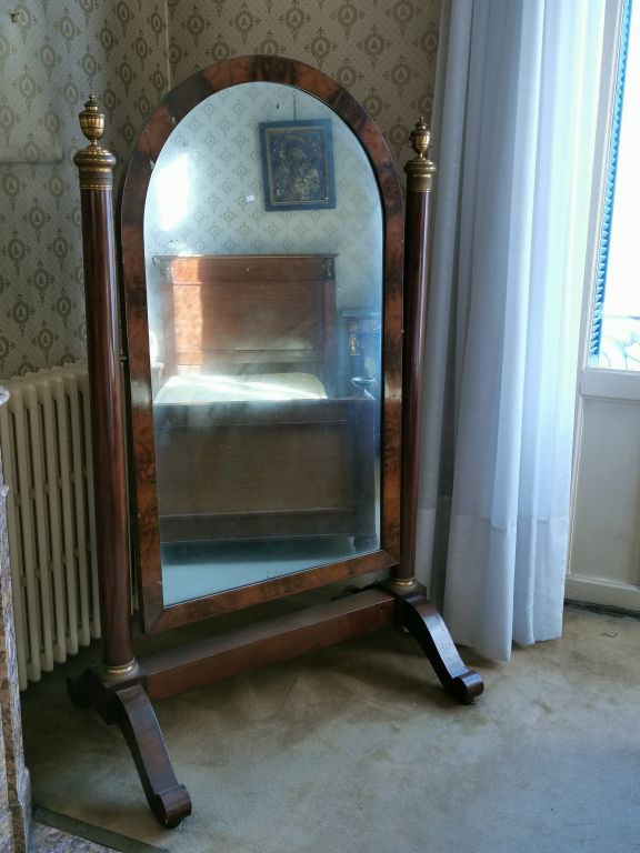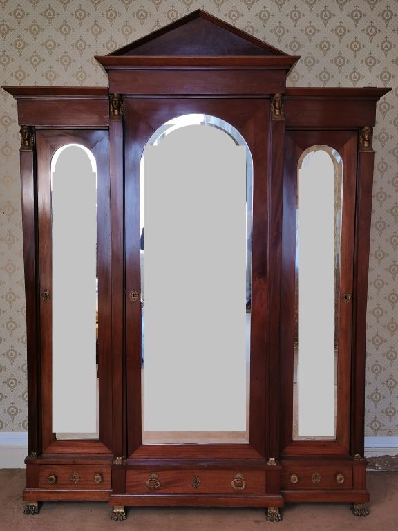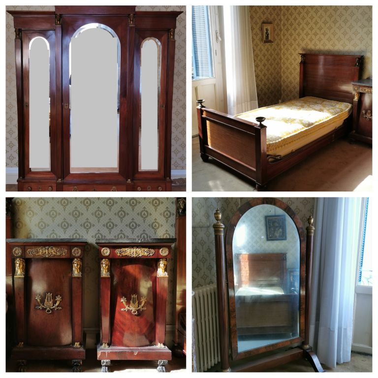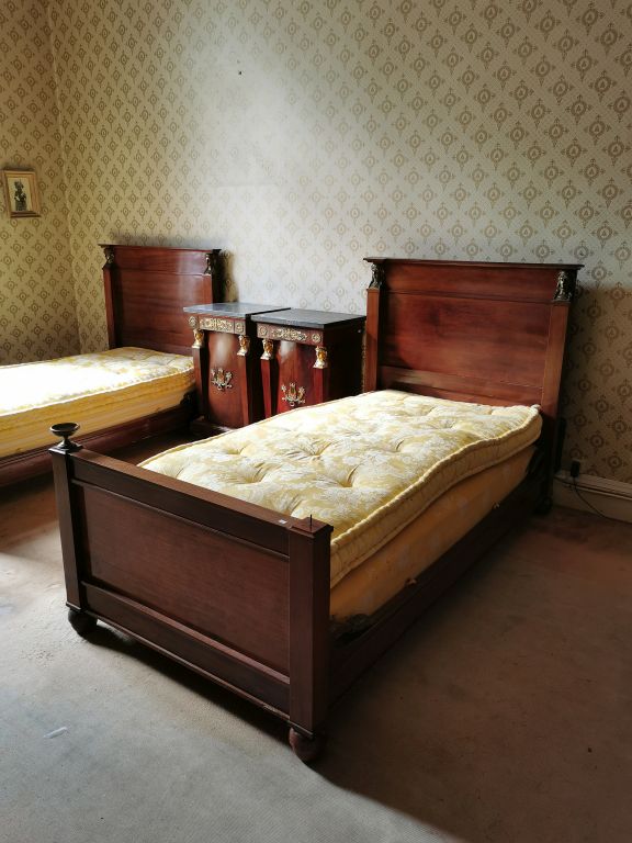 Mobilier de chambre à coucher Empire en acajou et placage d'acajou, ornementation de bronze doré, à décor d'égyptiennes, de cornes d'abondances, de lyres et de renommées ailées. Comprenant : - Paire de lits - Paire de chevets - Armoire à glace - psyché