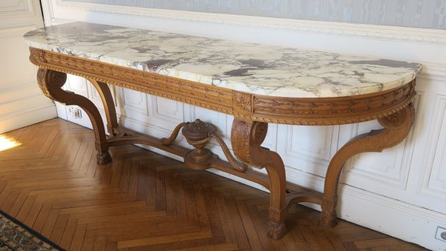Mobilier de salle à manger de style Louis XVI en chêne mouluré et sculpté, à décor de nœuds de ruban, de guirlande de feuillage, de sabots de biche et de tiges enrubannées, comprenant une large console dessus marbre brèche -une paire d’argentiers -une table à allonges -12 chaises cannées.