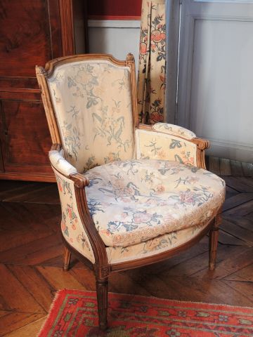 Mobilier de salon de style Louis XVI en noyer mouluré, comprenant une bergère et une duchesse brisée, belle garniture de toile de jouy, pieds cannelés et rudentés