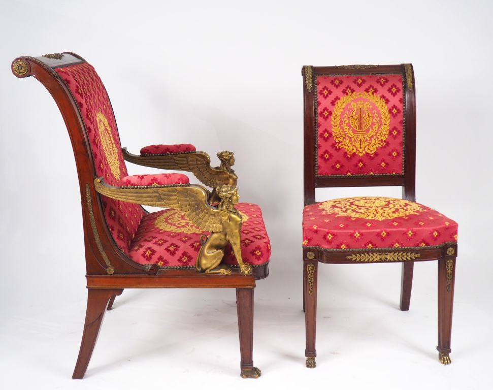 Mobilier de salon de style Retour d'Egypte en bronze et placage d'acajou à décor de sphinges, garniture de velours frappé framboise et vieil or comprenant : un canapé, une paire de fauteuils et une paire de chaises. (quelques petits chocs sur le placage)