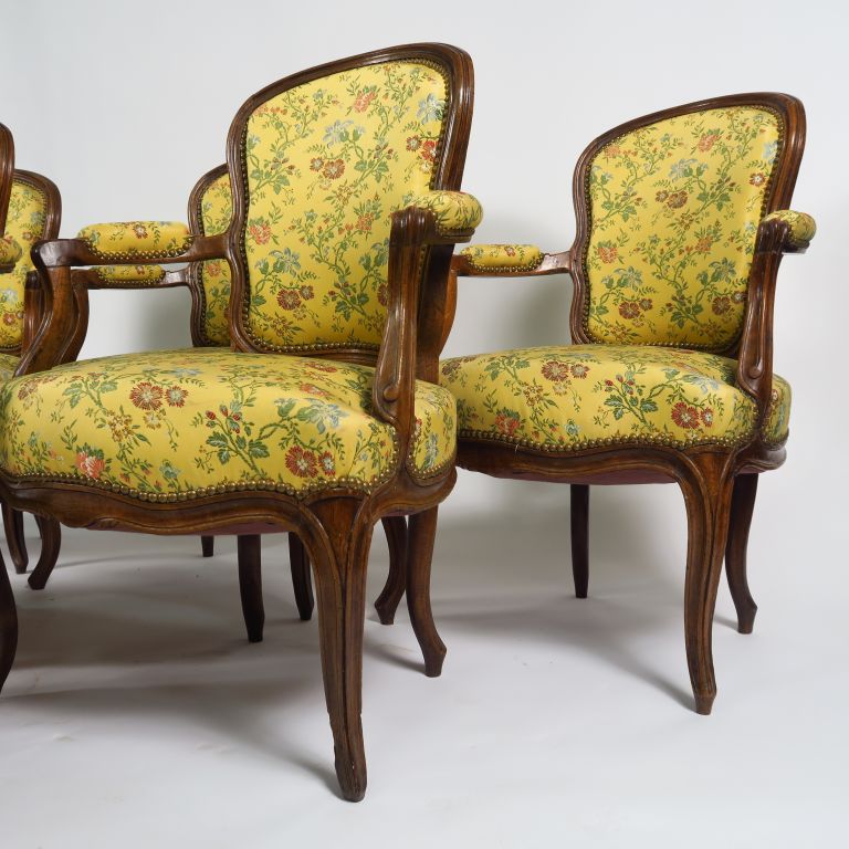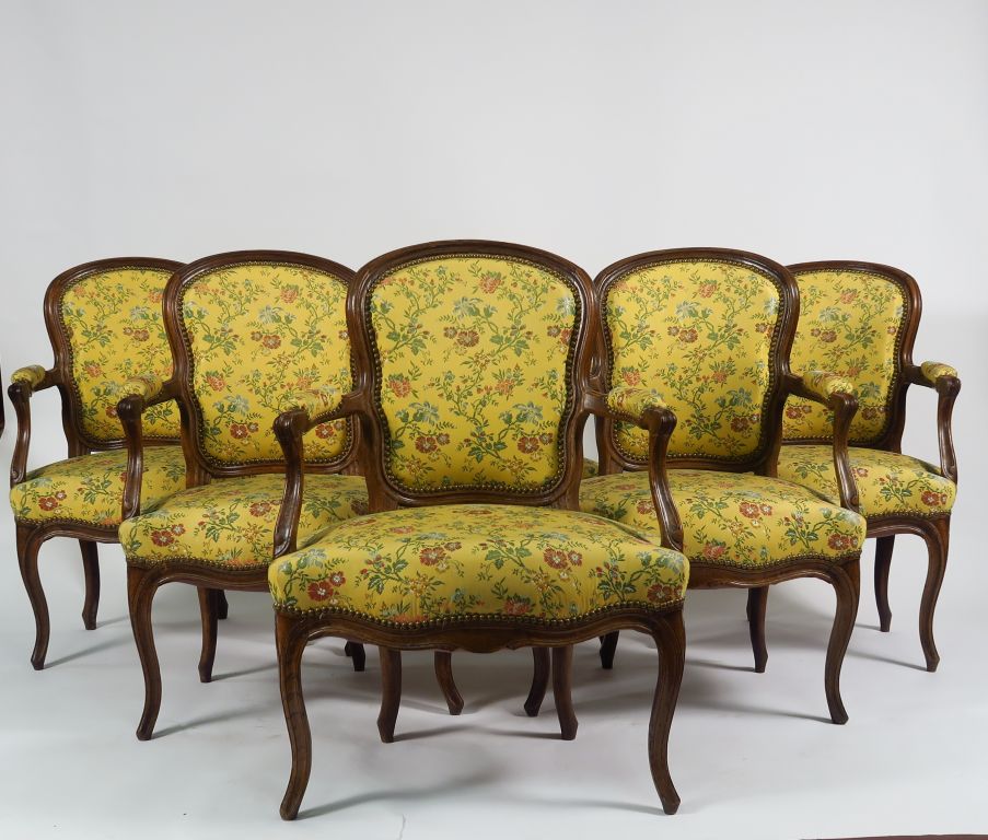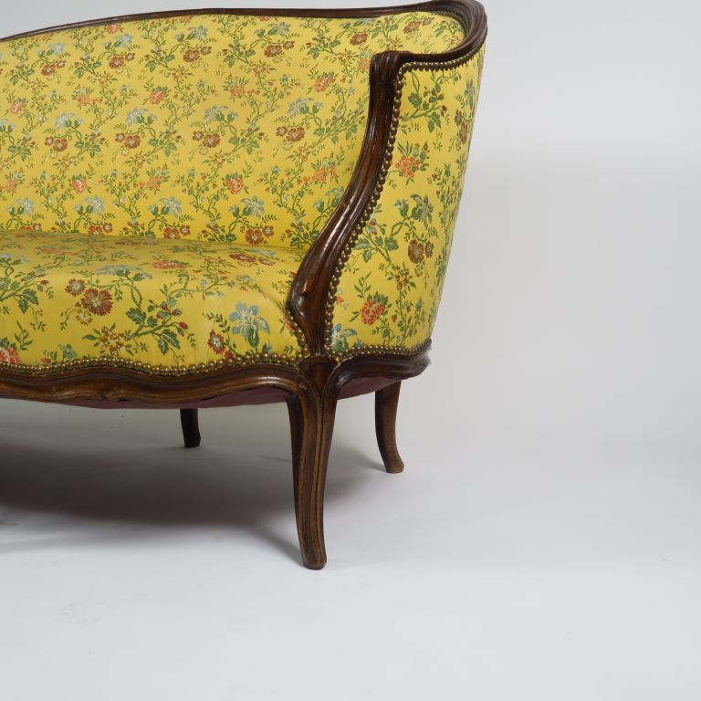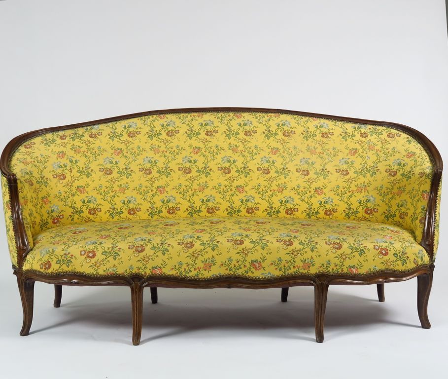 Mobilier de salon Louis XV en noyer mouluré, garniture de tissu jaune à fleurs comprenant : un canapé corbeille et une suite de six fauteuils.