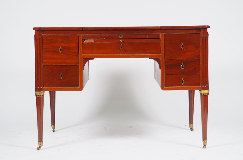 MOREAU (attribuée à) Coiffeuse d'homme Louis XVI en acajou et placage d'acajou, montants cannelés, pieds fuselés, ornementation de bronze doré. Dim. 75 x 107 x 59 cm. (fente sur le plateau)