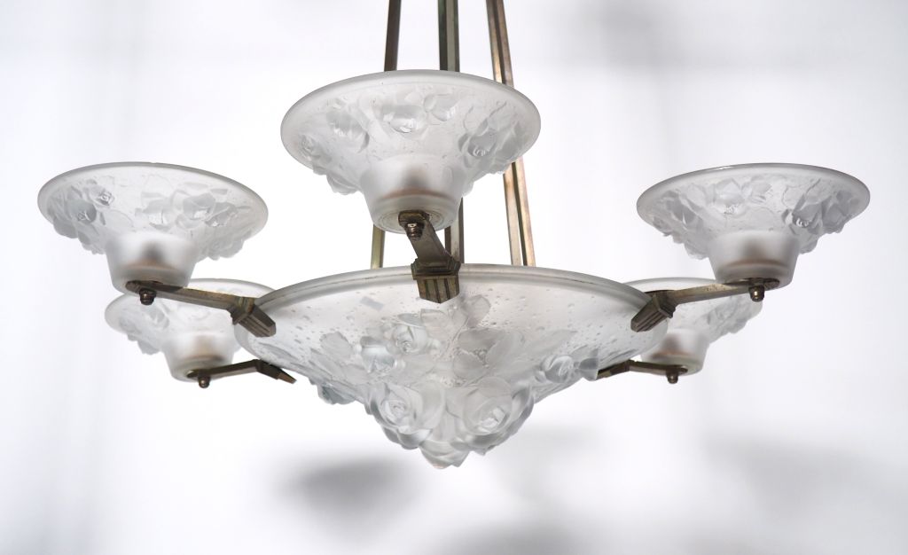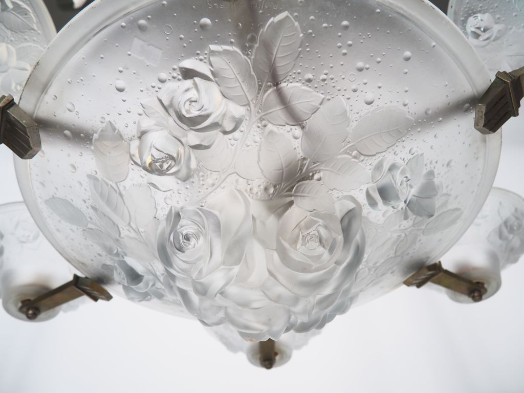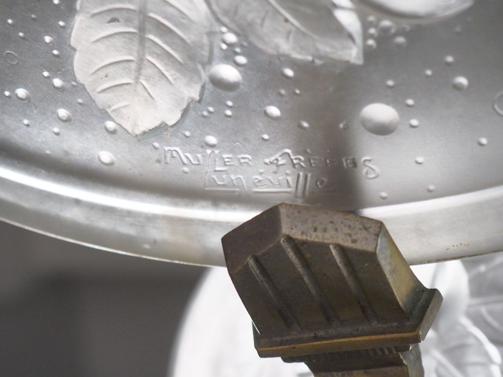 MULLER FRERES. Lustre en verre moulé à décor de fleurs, éclairant à six lumières. Signé H. 86 cm (quelques petites égrenures sur le rebord des coupelles et de la vasque).