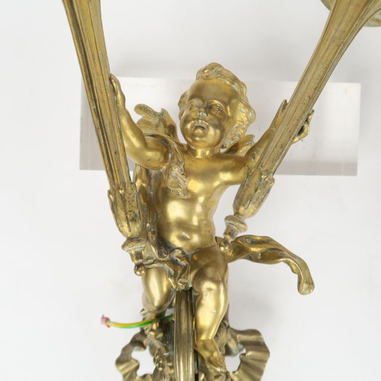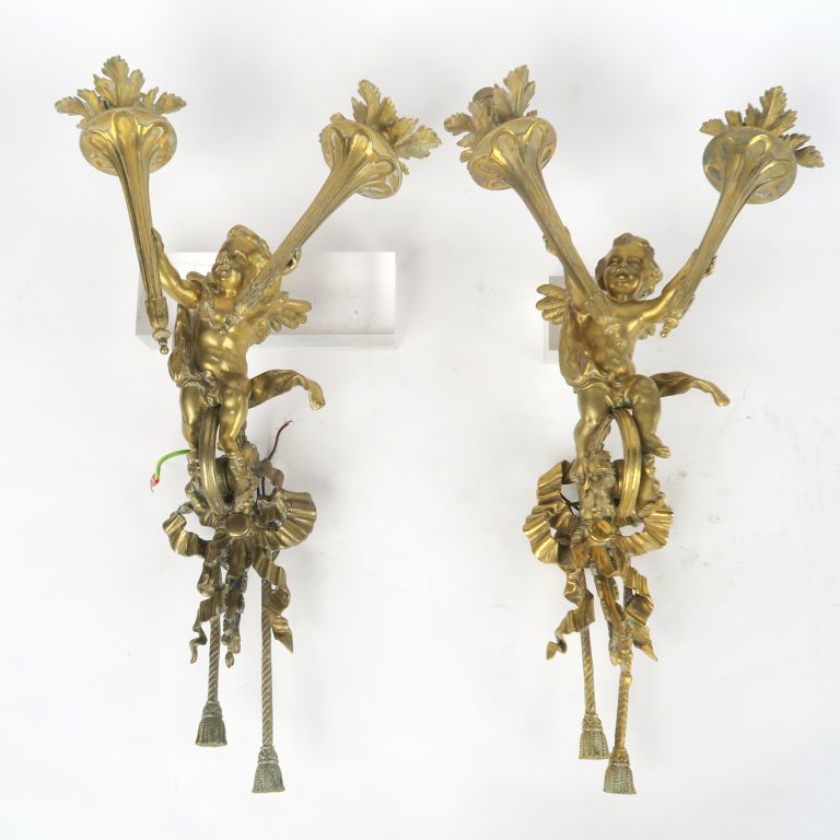 Paire d'appliques doubles de style Louis XVI en bronze à décor d'amour porte torchère H. 46 cm