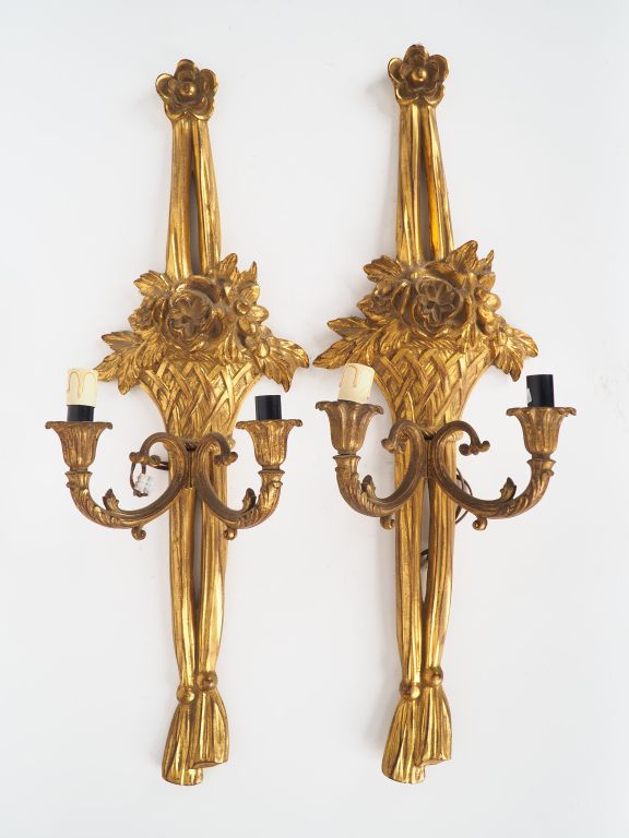 Paire d'appliques murales de style Louis XVI en bois sculpté et doré, à décor de panier fleuri, éclairant à deux lumières. Dim. 73 x 22 cm
