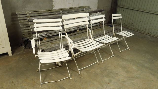 Paire de bancs de jardin (mauvais état) paire de fauteuils et quatre chaises de jardin un guéridon (mauvais état)