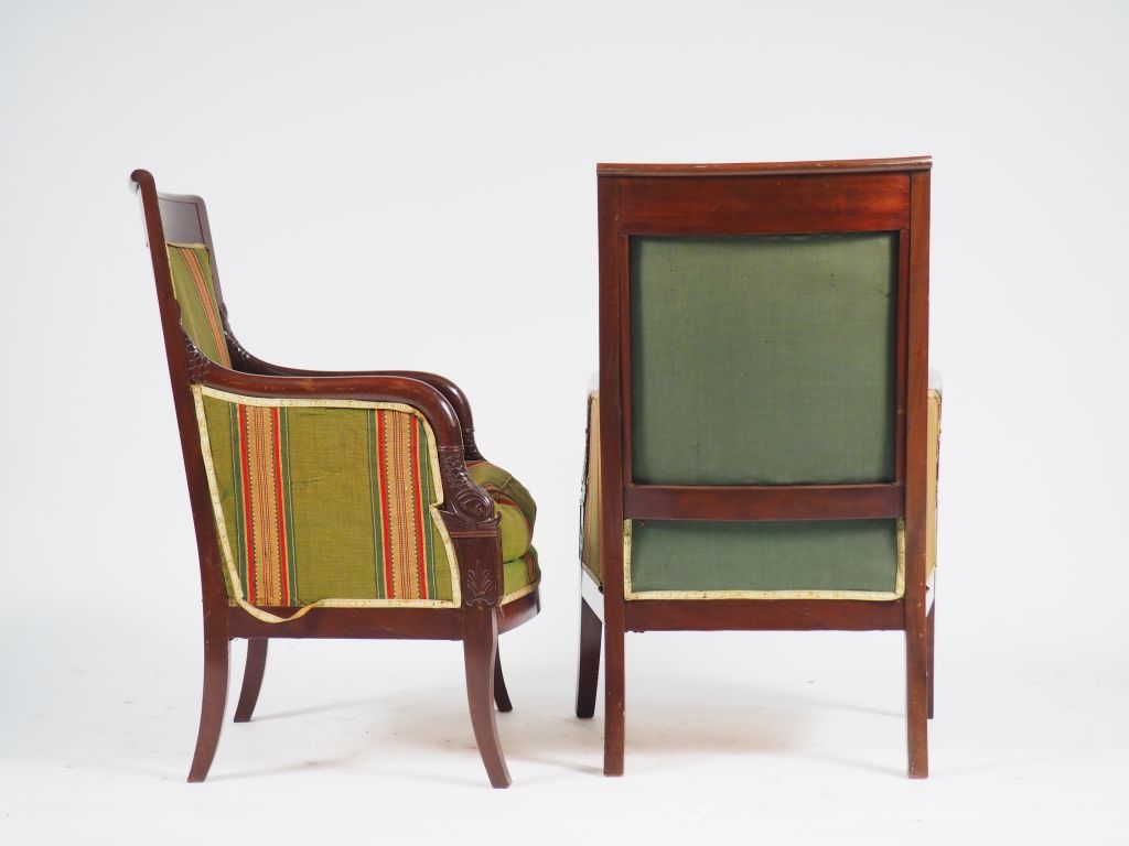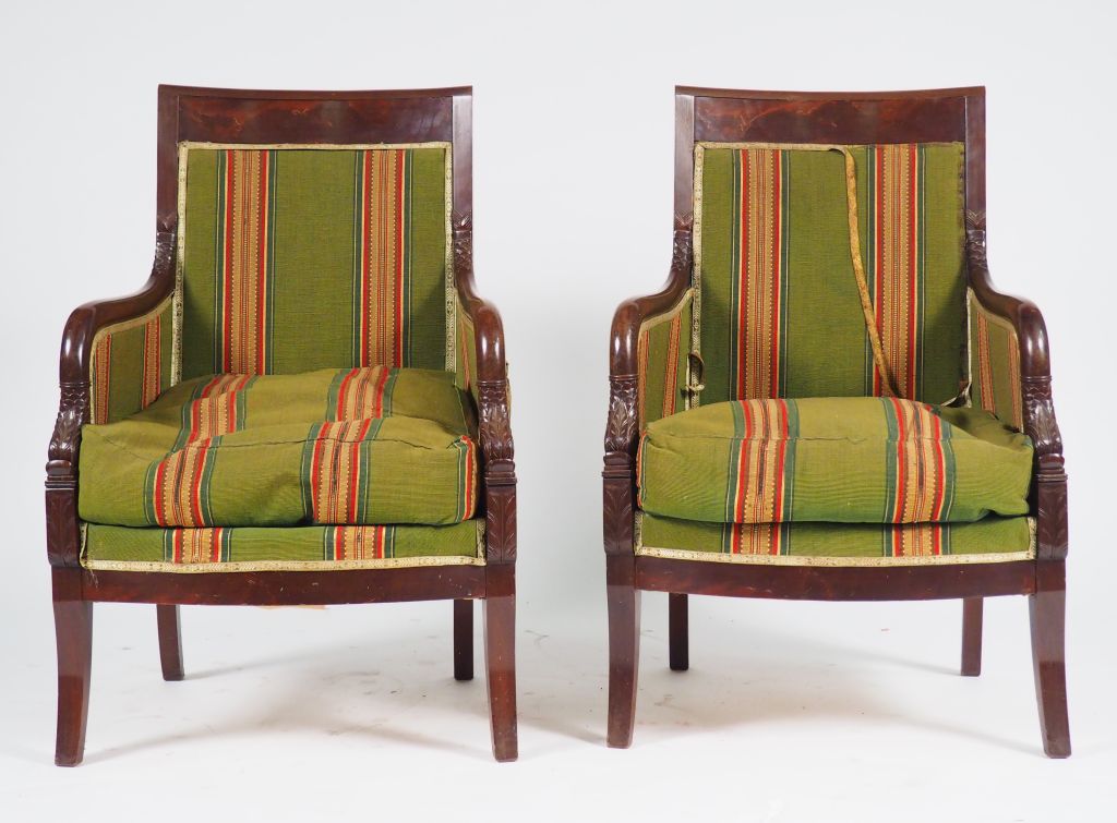 Paire de bergères de style Empire en acajou, accotoirs à décor de dauphins, piètement sabre. Garniture de tissu rayé (mauvais état) Dim. 93,5 x 64 x 49,5 cm