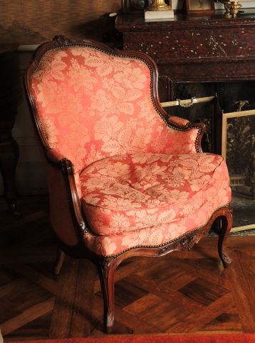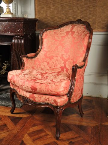 Paire de bergères Louis XV en bois naturel mouluré et sculpté à décor de fleurs, dossier arrondis et à ressaut, montants d’accotoirs en coup de fouet, pieds galbés, garniture de soierie vieux rose