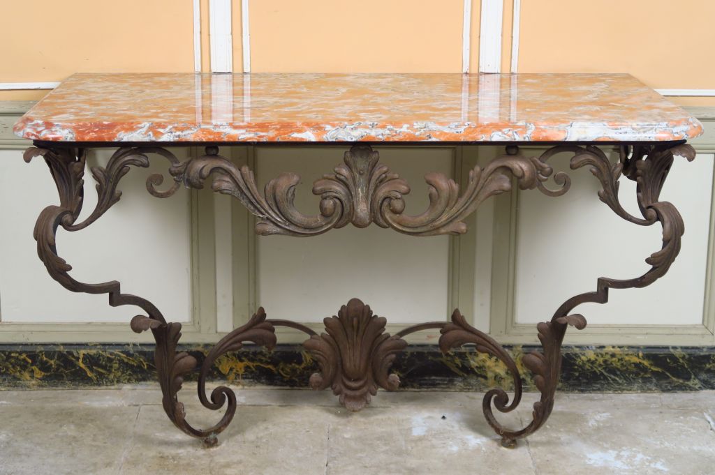 Paire de consoles de style Louis XV en tôle et fer forgé. Dessus marbre rose.