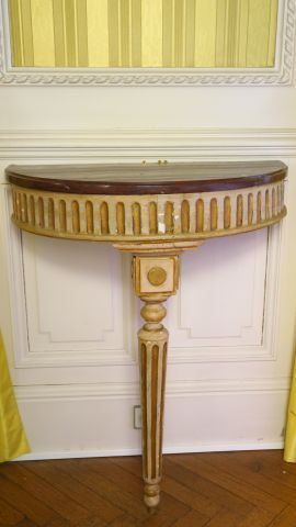 Paire de consoles demi-lune de style Louis XVI reposant sur un pied en bois laqué blanc et doré, à décor de cannelures, dessus marbre rouge