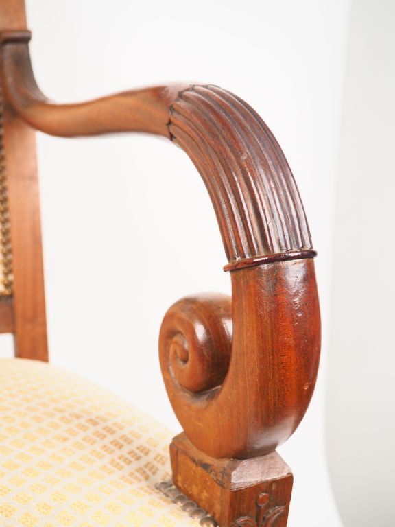 Paire de fauteuils à crosse XIXème en acajou et placage d'acajou, piétement sabre.