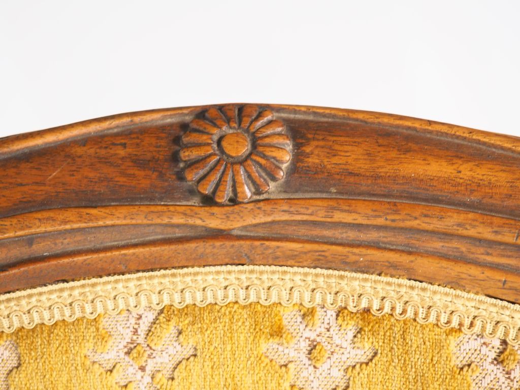 Paire de fauteuils Directoire en noyer, mouluré et sculpté, montants d'accotoirs balustre, pieds fuselés, dossier renversé, Dim. 89 x 51 x 57 cm