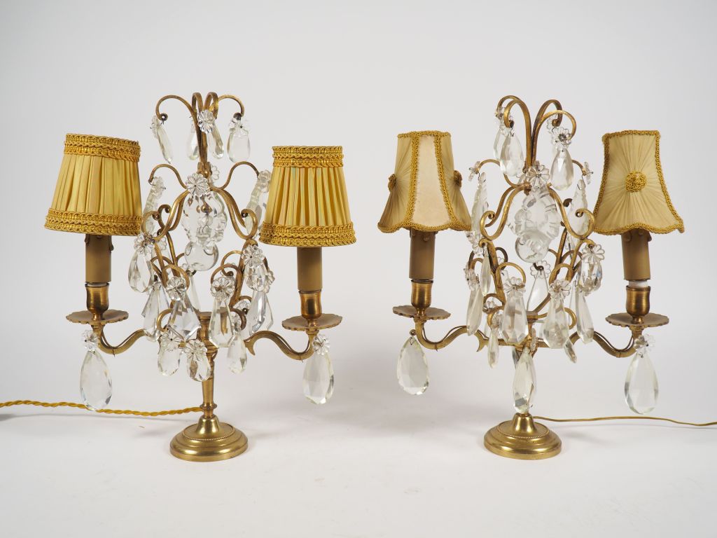 Lot de Paire de girandoles doubles en laiton et cristal. H. 39 cm (manques) au prix de 100 à 150 € en vente aux enchères par l'hôtel des ventes Primardeco