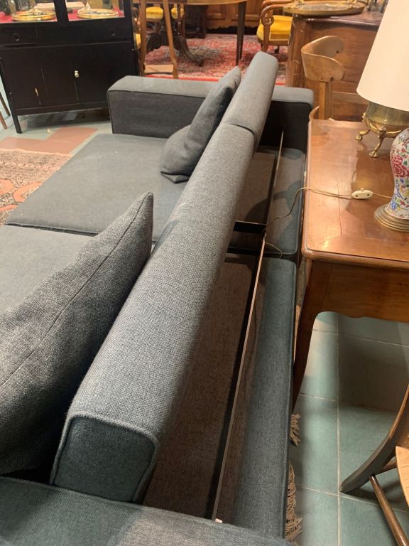 Paire de grands canapés modernes, garniture de tissu anthracite. Dim. 80 x 242 x 108 cm