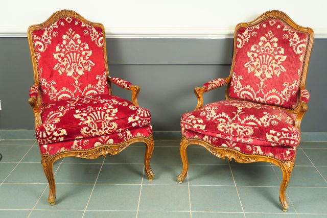 Paire de grands fauteuils à dos plat Louis XV, en bois naturel mouluré et sculpté à décor de fleurettes et de feuillage, garniture de velours frappé.