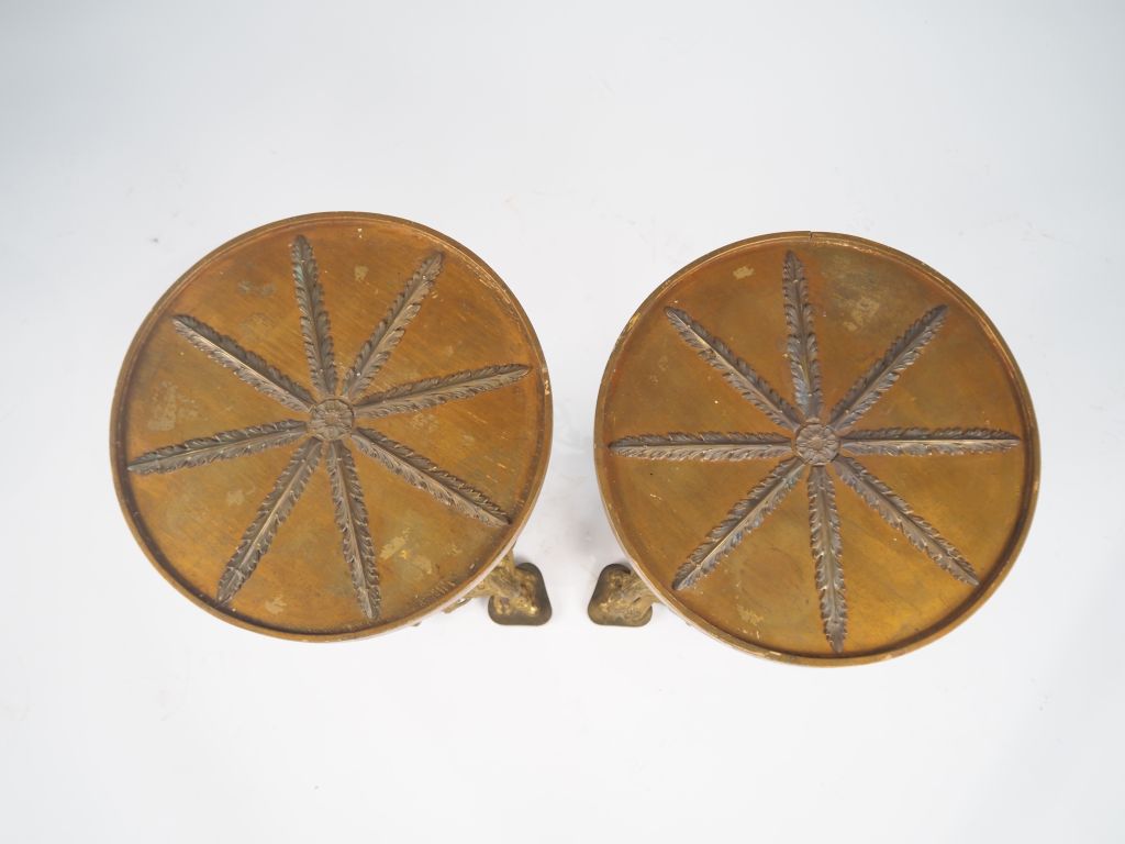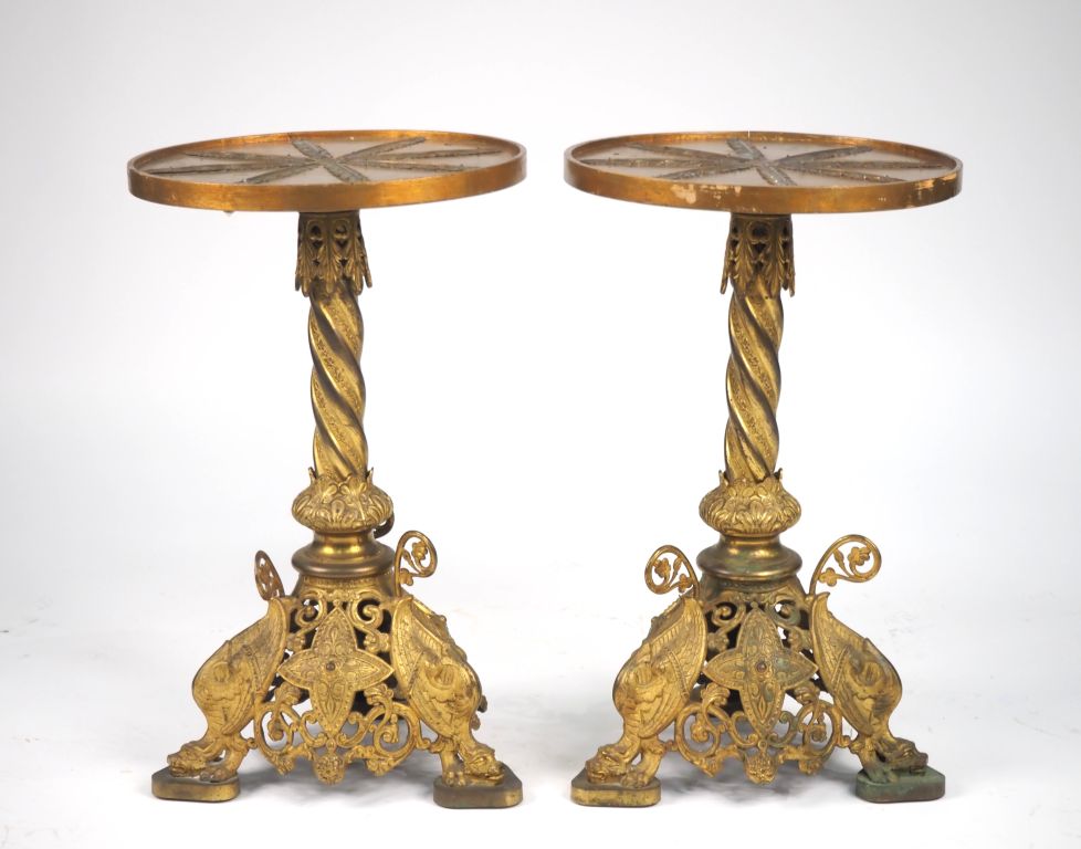 Paire de guéridons Napoléon III de style Renaissance en laiton à décor ajouré de chimères, de rinceaux feuillagés et de guirlandes de fleurs, plateau en bois circulaire à décor de palme de laurier. Dim. 68 x 42 cm