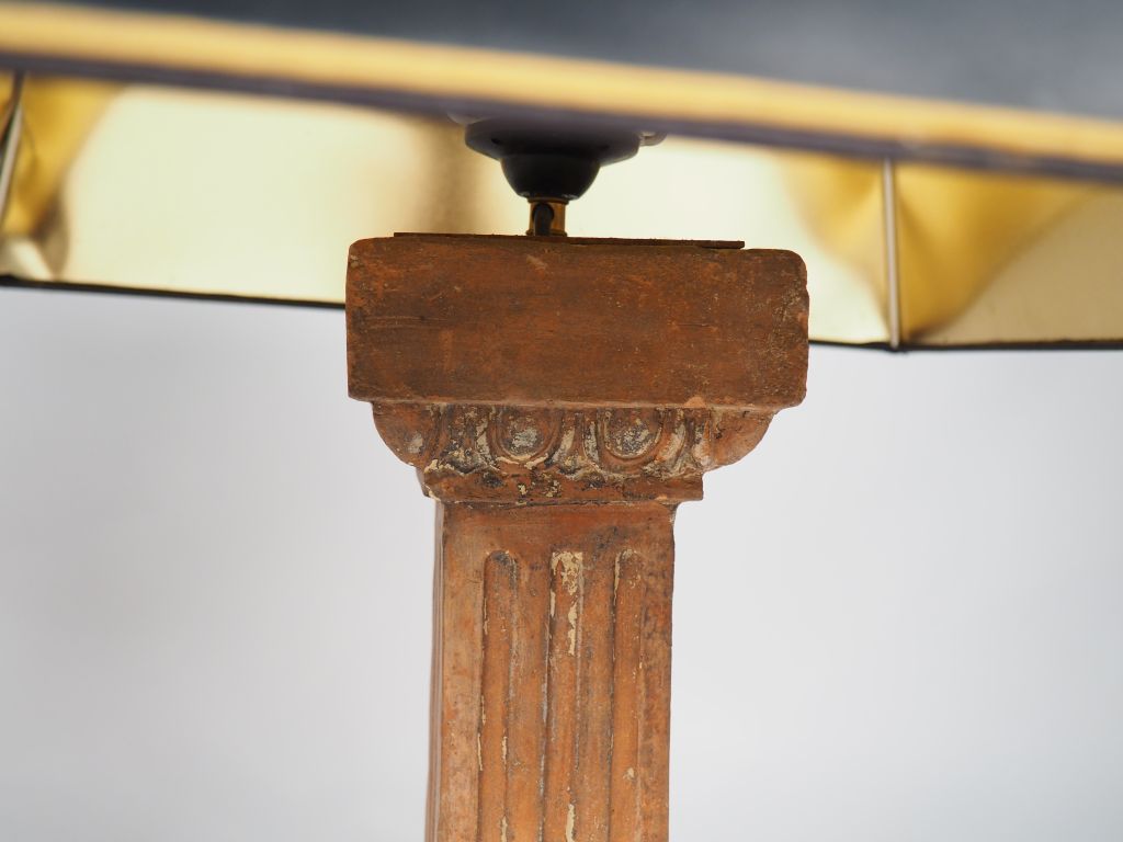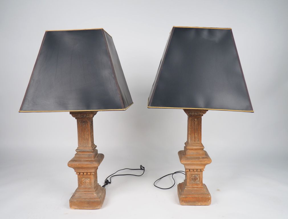 Paire de lampes en terre cuite en forme de colonne, abat-jours noirs. H. (colonne) : 56 cm.