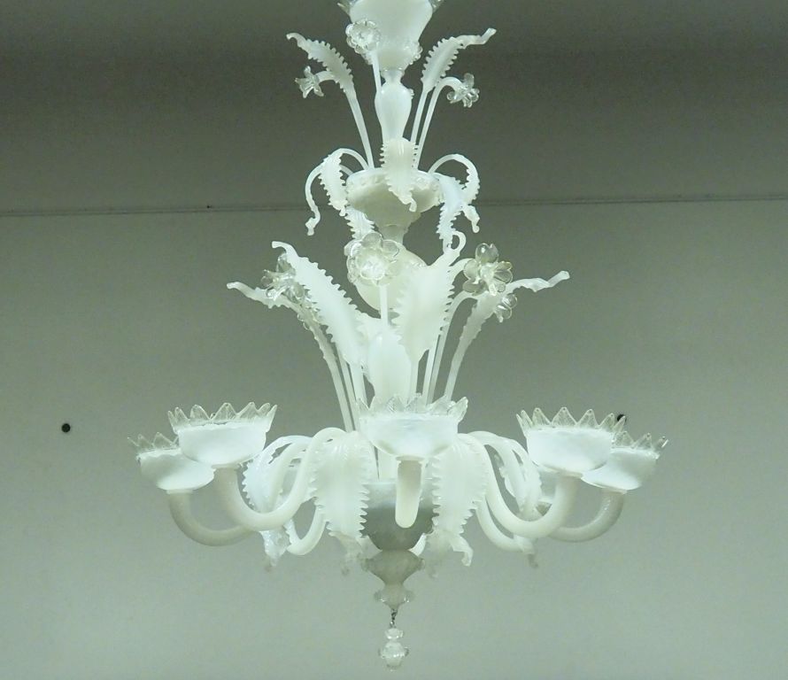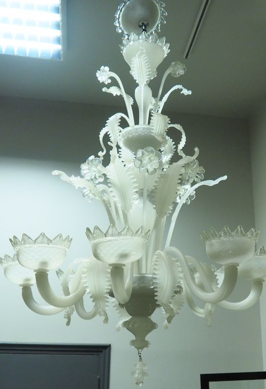 Paire de lustres en verre opalescent de Venise à décor de fleurs et de palmes. Eclairant à 8 lumières. Dim. 120 x 90 cm.
