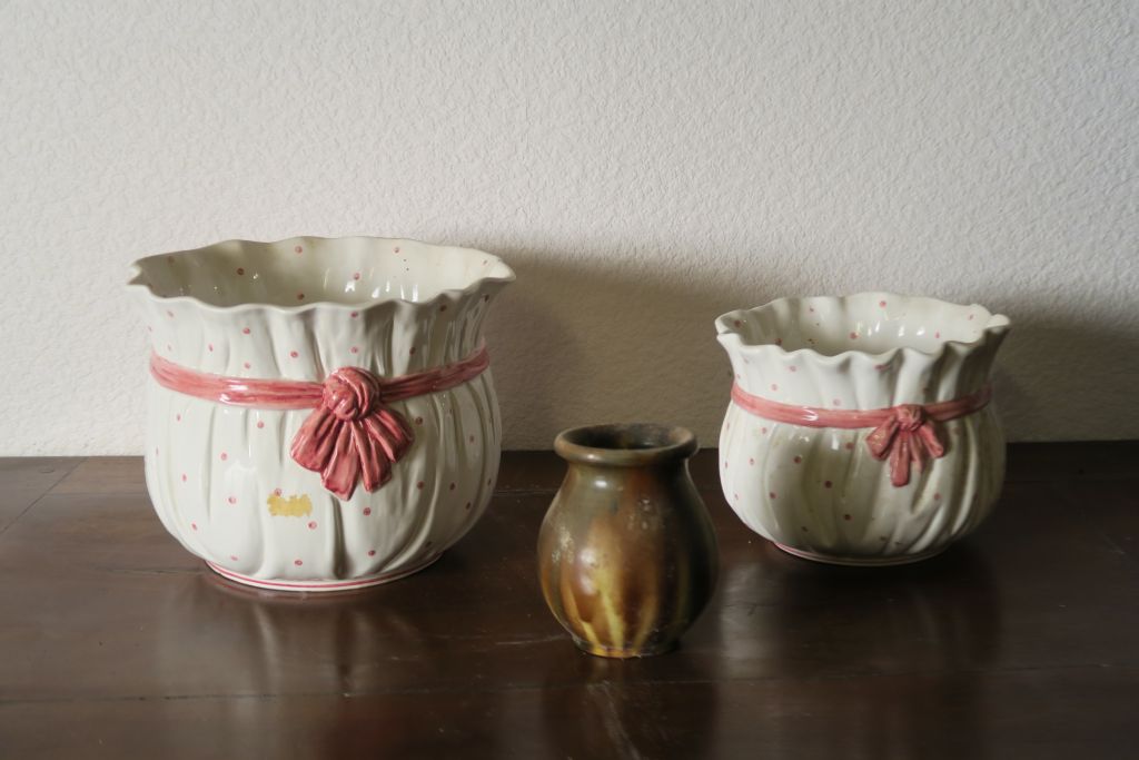 Paire de pots en barbotine à décor d'un nœud de ruban. Vase en terre vernissée de Vallauris. H. 12 cm.