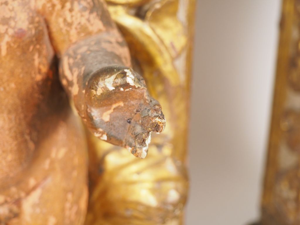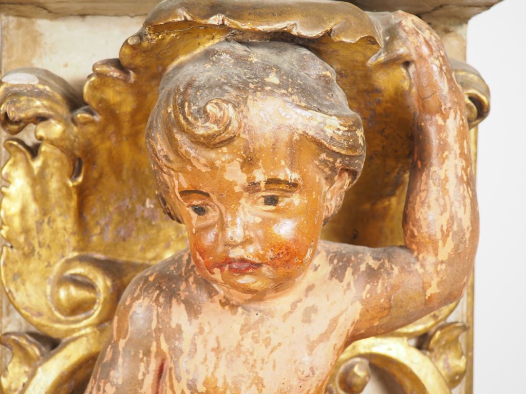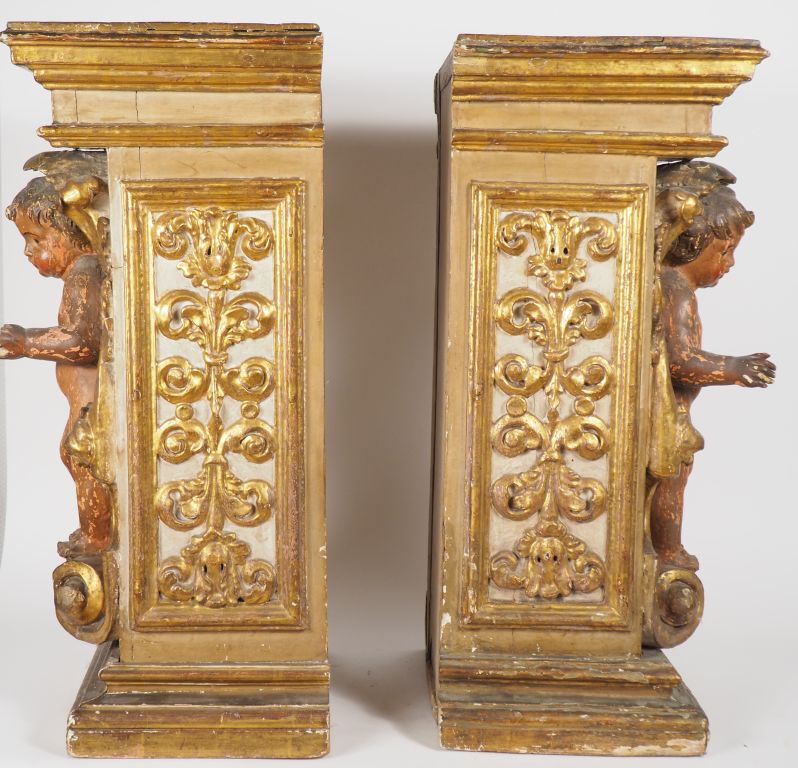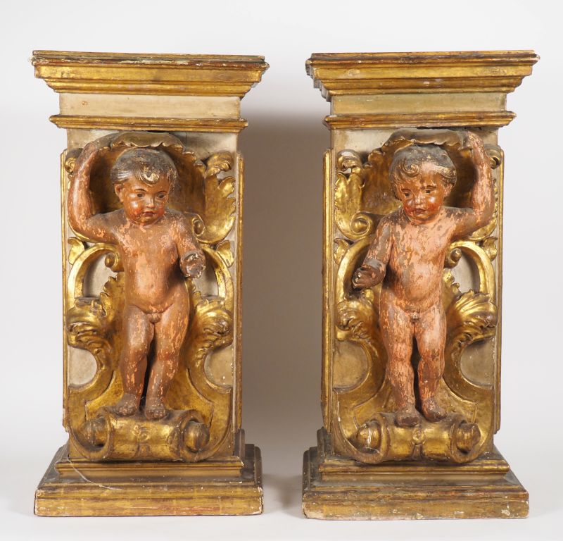 Paire de sellettes italiennes fin XVIIIème début XIXème en bois polychrome sculpté à décor en relief d'amour sur fond de cartouche feuillagé. Dim. 80 x 39 x 34 cm. (petits accidents).