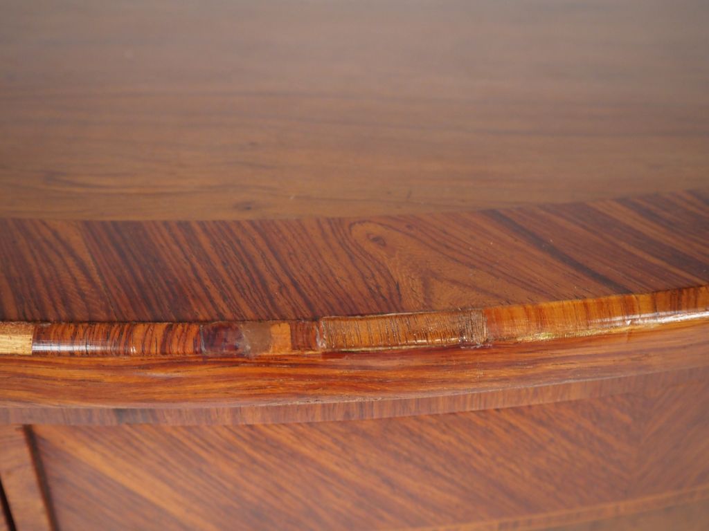 Paire d'encoignures de style Louis XVI en marqueterie à décor de cannelures en trompe l'œil, ouvrant à deux portes légèrement cintrées. H. 85 x 84 x 50 cm (quelques sauts de placage)