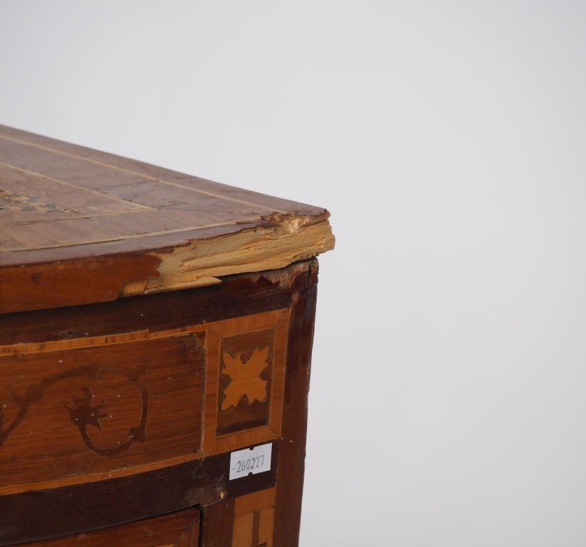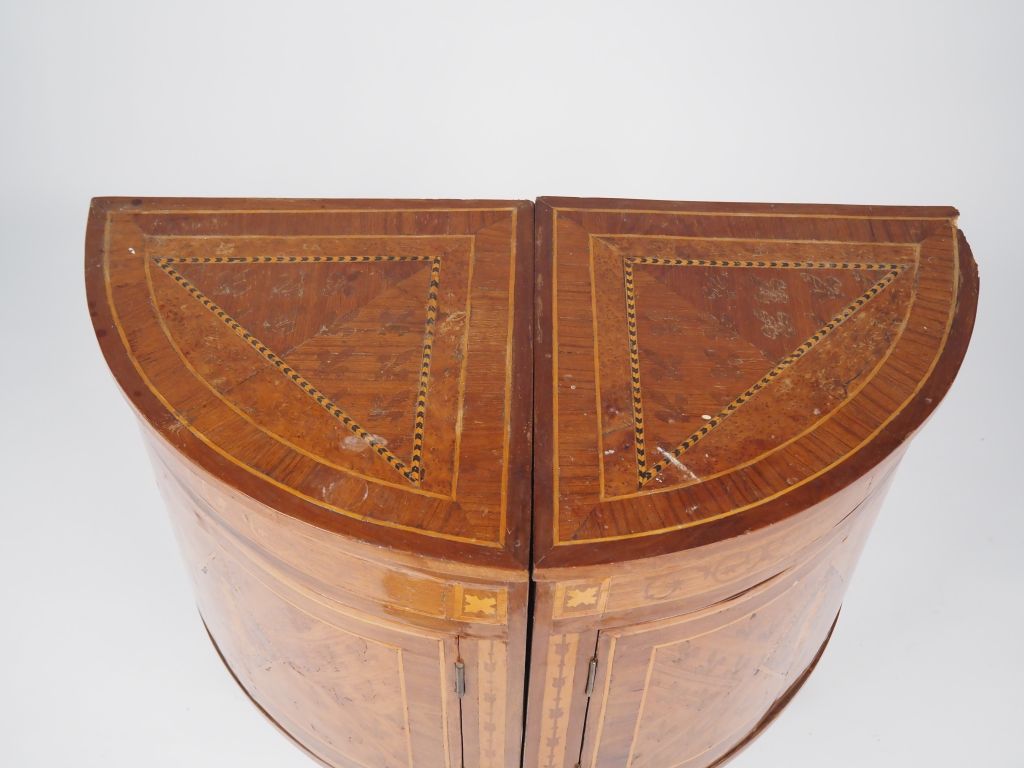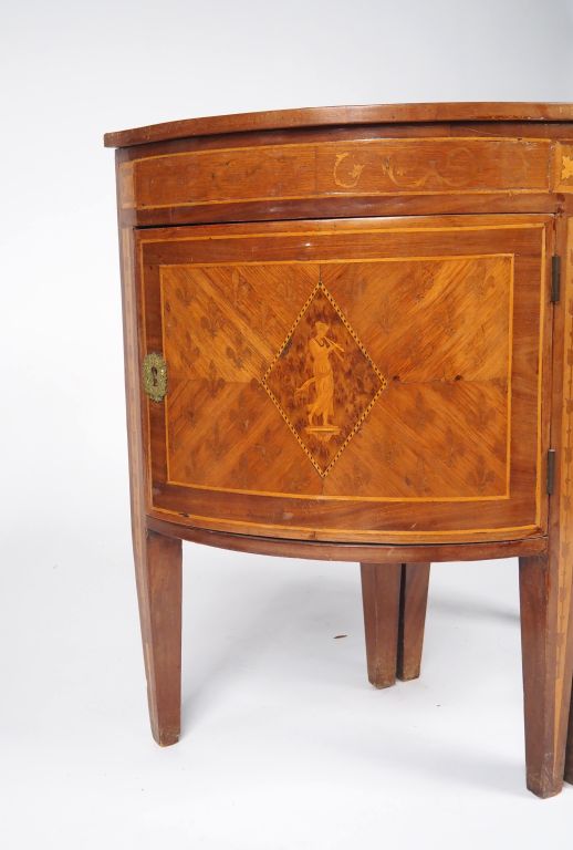 Paire d'encoignures italiennes XIXème en marqueterie, à décor dans des réserves de muses sur fond de fleur de Lys. Dim. 79,5 x 40,5 x 57 cm
