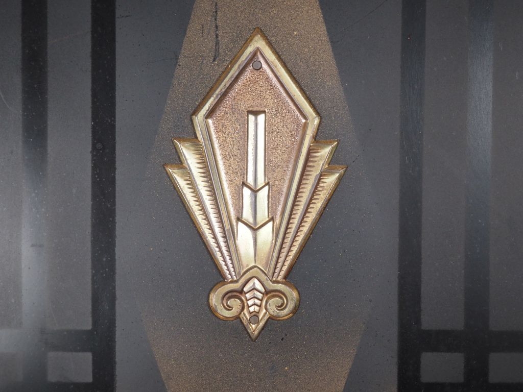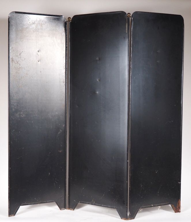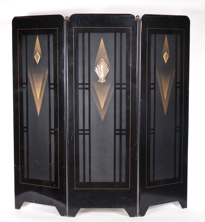Paravent années 70 de style Art Déco en métal laqué noir et doré, à décor de motifs géométriques, 3 brins Dim. 109 x 105 cm (chocs)
