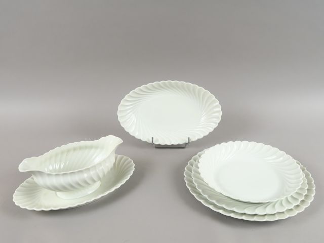 Partie de service de table en porcelaine blanche et partie de service de table en faïence de Gien à décor de rinceaux bleu sur fond blanc