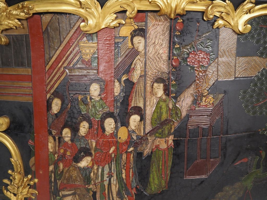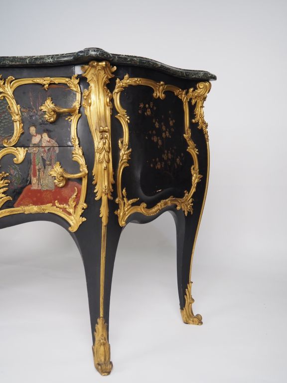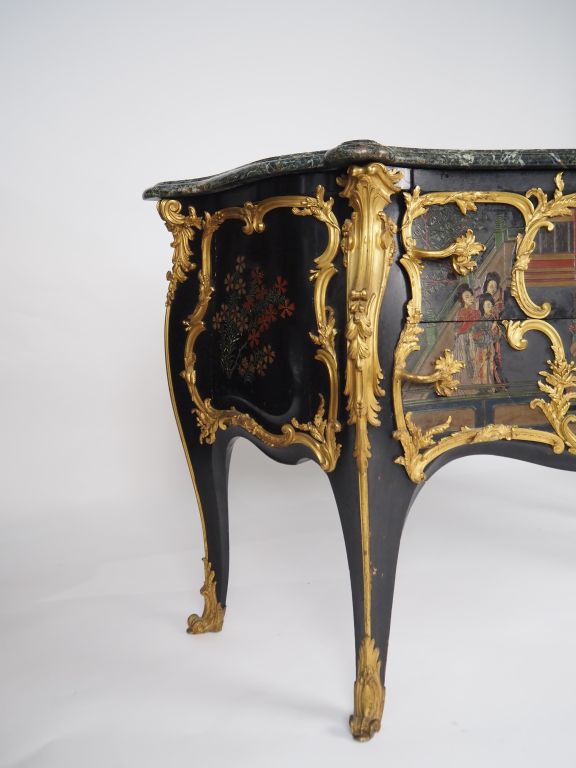 Paul SORMANI Grande et large commode de style Louis XV en laque de Coromandel à décor de personnages, ouvrant à deux tiroirs sans traverse, très riche et superbe ornementation de bronze doré , dessus marbre. Estampillée Dim. 95 x 163 x 60 cm (quelques sauts de placage et sauts de laque)