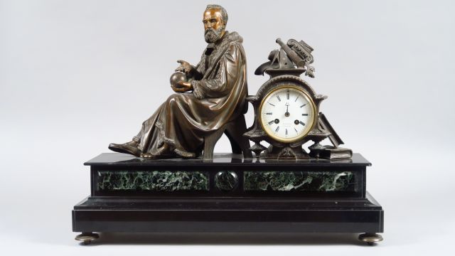 Pendule de cheminée Napoléon III en régule et marbre bicolore « Copernic » H. : 48 cm