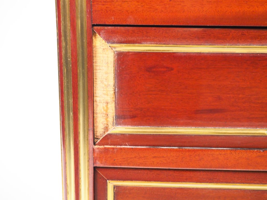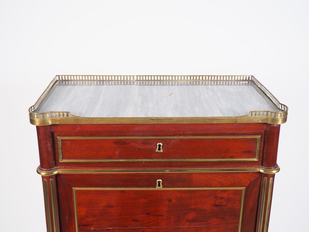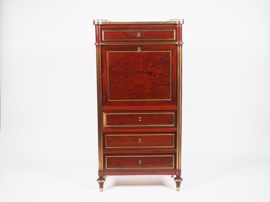 Petit secrétaire Napoléon III de style Louis XVI en acajou et placage d'acajou, ouvrant à quatre tiroirs et un abattant, ornementation de laiton, dessus marbre gris à galerie. Dim. 128 x 33,5 x 65 cm (petits accidents)