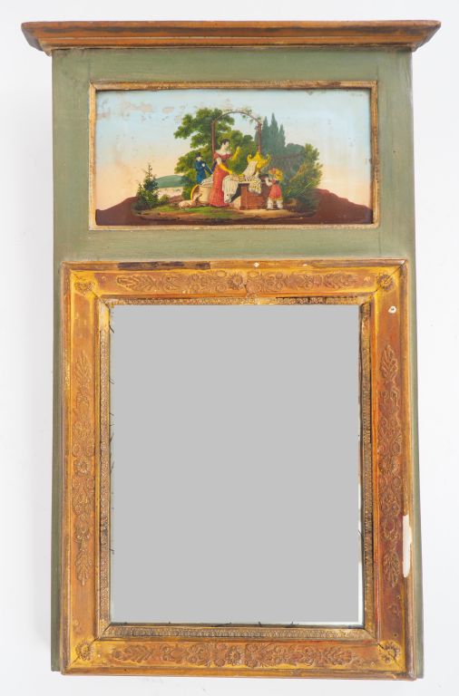 Petit trumeau Directoire en bois peint polychrome. Orné d'une peinture fixée sous verre représentant une scène familiale. Dim: 53,5 x 43,5 cm. Dim. fixé sous verre: 12 x 23,5 cm