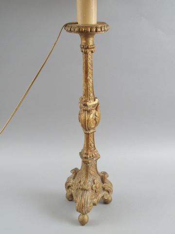 Lot de Pique-cierge XVIIIème en bois doré, monté en lampe au prix de 30 à 50 € en vente aux enchères par l'hôtel des ventes Primardeco