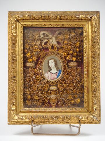 Reliquaire début XIXème en paperolle (petits accidents). 31 x 25 cm , cadre d'époque