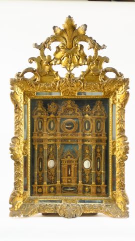 Reliquaire fin XVIIème début XVIIIème en paperolle, cadre à parecloses en bois sculpté et doré. Dim. 101,5 x 60 cm 101 x 60 cm