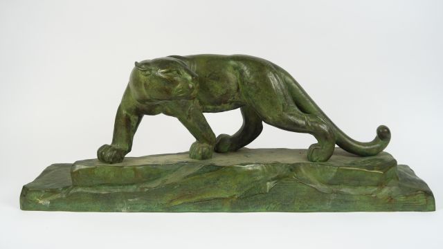 Lot de RIOLO. 'Panthère'. Sculpture en bronze à patine verte. Signée au prix de 600 à 800 € en vente aux enchères par l'hôtel des ventes Primardeco