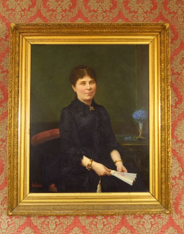 SALIERES Ecole française XIX ème "Portrait d'élégante à l'éventail" Huile sur toile, signée en bas à gauche, joli cadre en stuc doré 100 x 81 cm