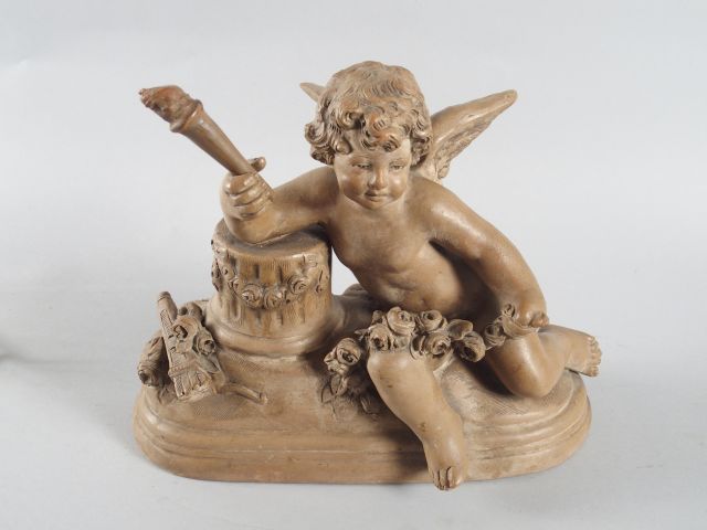 Lot de Sculpture en terre cuite patinée 'Amour'. H. : 28 cm au prix de 100 à 150 € en vente aux enchères par l'hôtel des ventes Primardeco