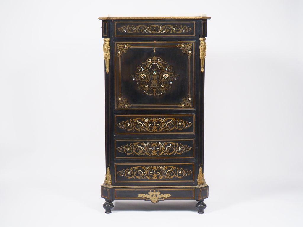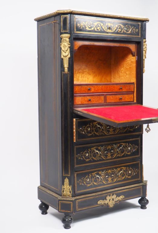 Secrétaire à abattant Napoléon III de style Louis XVI en marqueterie Boulle, à décor de rinceaux feuillagés et fleurs, ouvrant à quatre tiroirs et un abattant, ornementation de bronze, dessus marbre blanc. Dim. 63 x 73 x 40 cm