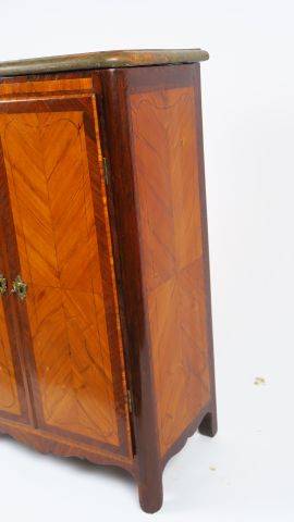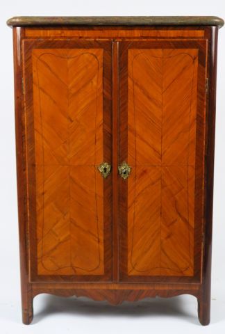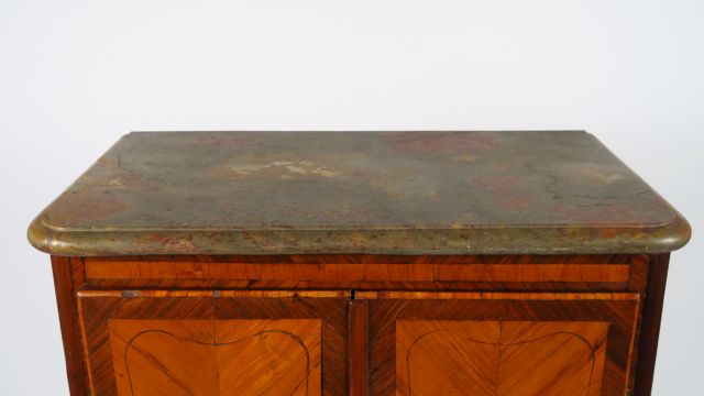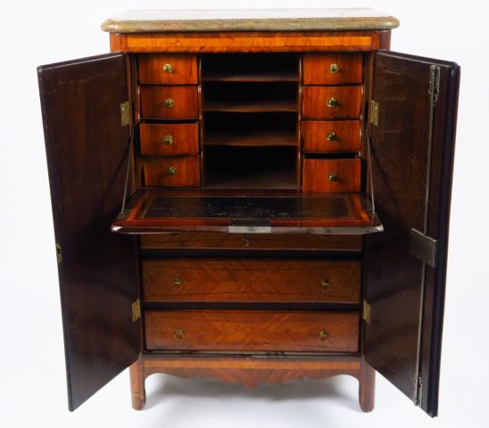 Secrétaire de dame Louis XV en marqueterie, ouvrant à deux portes dégageant un élégant intérieur à un abattant et trois tiroirs, dessus marbre brèche (postérieur). Estampillé Boudin.