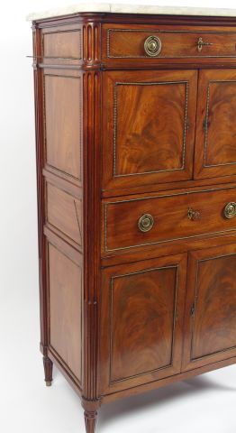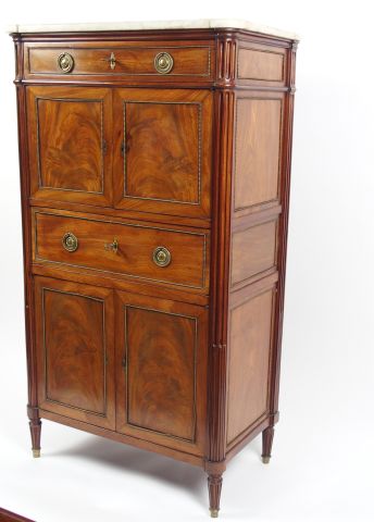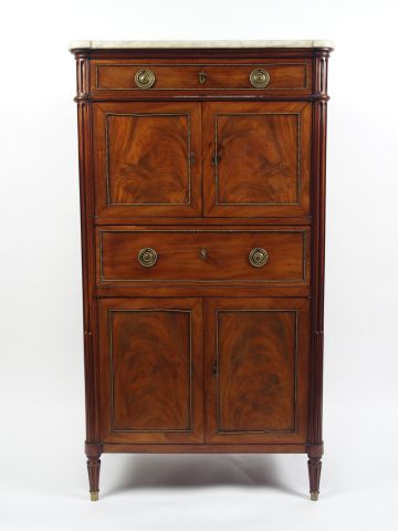 Secrétaire Louis XVI en acajou et placage d'acajou, ouvrant à un tiroir, quatre vantaux et un abattant, dessus marbre blanc, montants cannelés et rudentés.