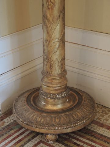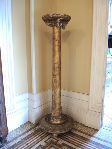 Sellette 1900 en bois et stuc doré, à décor de branches d’oliviers et de chapiteaux de style composite (sauts de dorure) H. : 1.30 m