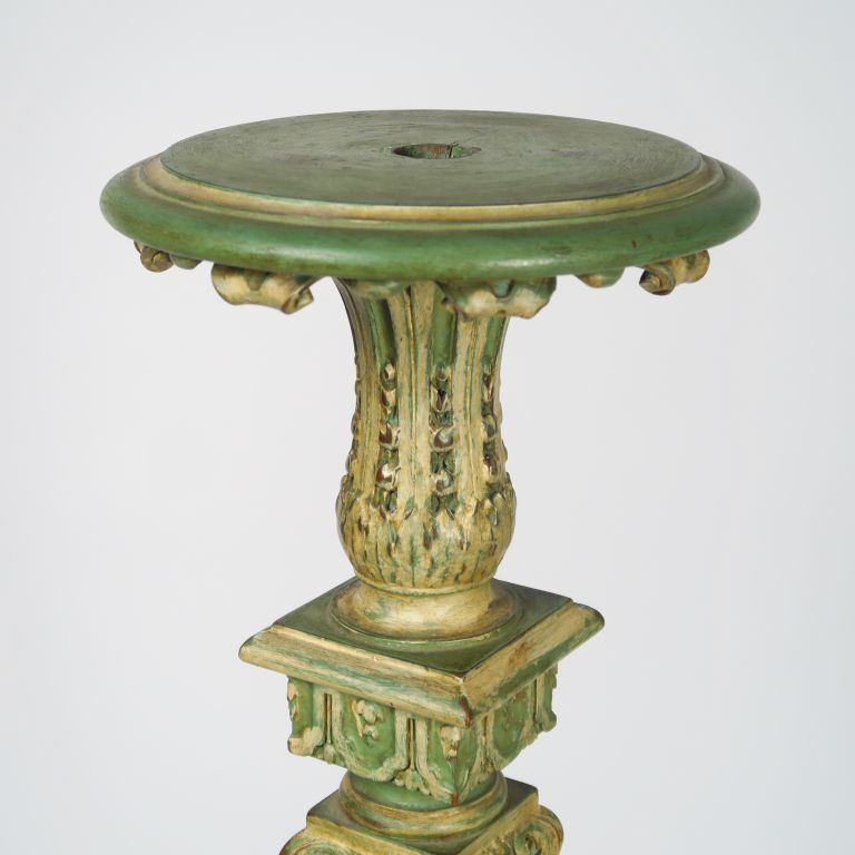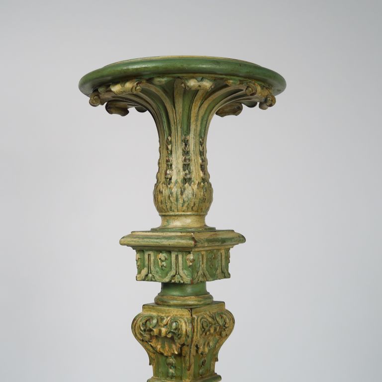 Sellette de style Louis XIV en bois sculpté et mouluré à décor de fleurons, de coquilles et de cannelures rudentées, laqué vert et blanc. H. : 127 cm.